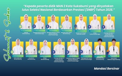 Warudoyong (KEMENAG) Sebanyak 15 siswa kelas XII MAN 2 Kota Sukabumi dinyatakan lolos Seleksi Nasional Berdasarkan Prestasi (SNBP) tahun 2026. Inform
